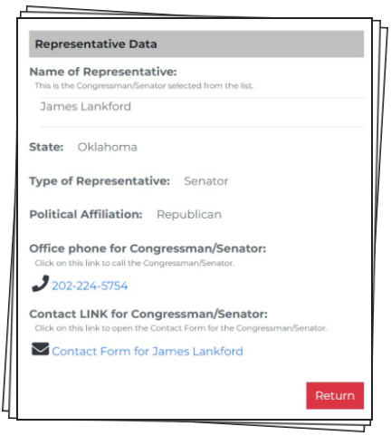 We provide a feature that will allow you to send an “email” or place a phone call to an elected member of Congress (Senator or House of Representatives). We try to make it easy to voice your opinion. We also provide you access to the US Government website where you can see the legislation and voting record of your representatives.